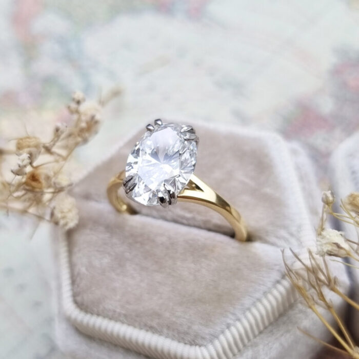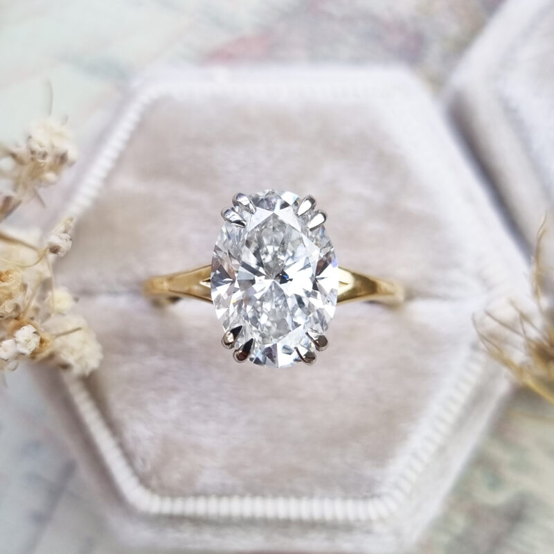Central lab grown diamond: 3.7ct, oval cut, E colour, VS1 clarity, IGI certified (this is the minimum size and quality, if the diamond is sourced at a higher size/quality then no extra charge will be added)