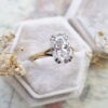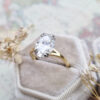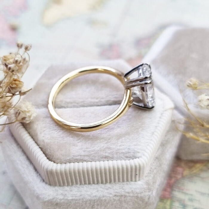 This brand new ring features a central stunning 3.7ct oval cut lab grown diamond. It has been double talon set in a platinum head, with a slim 18ct yellow gold split style band!