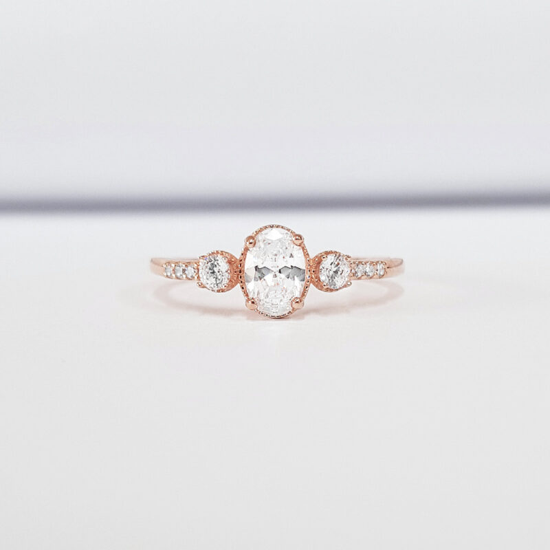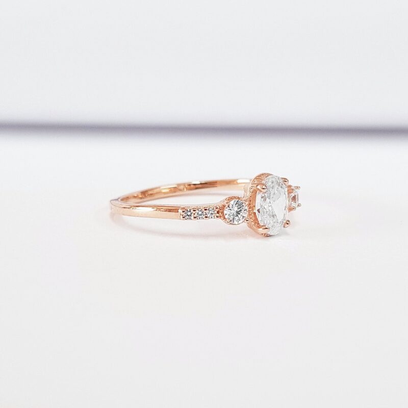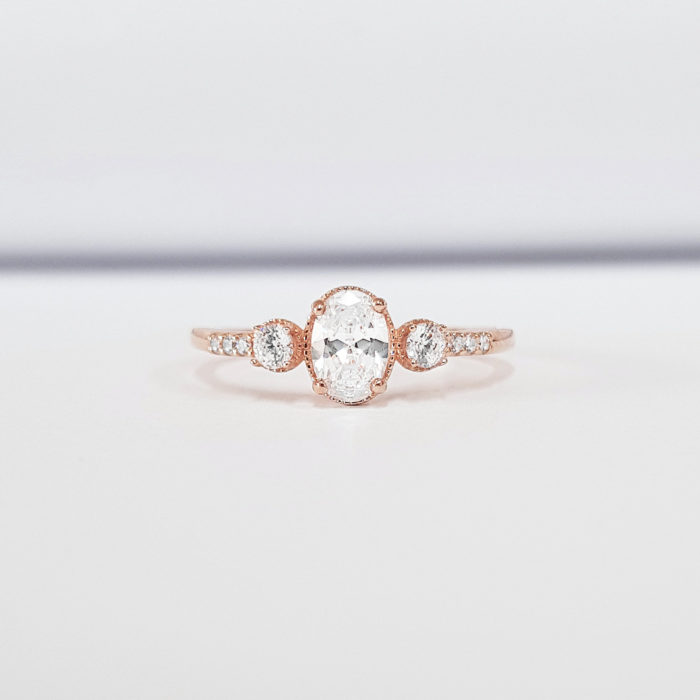 Oval moissanite diamond milgrain trilogy 3 stone engagement ring handmade in rose/white/yellow gold or platinum petite delicate low profile