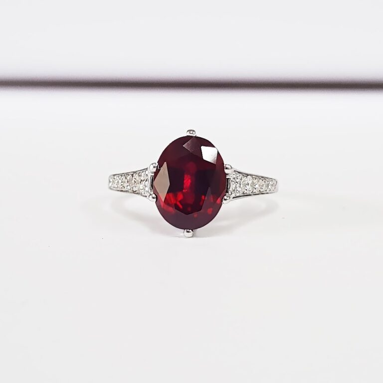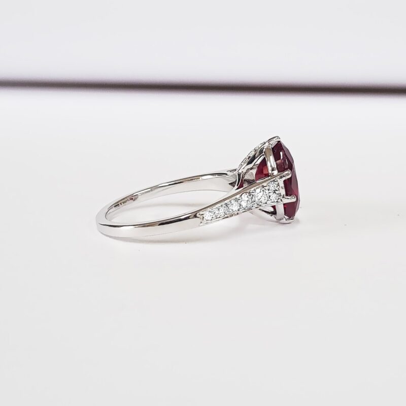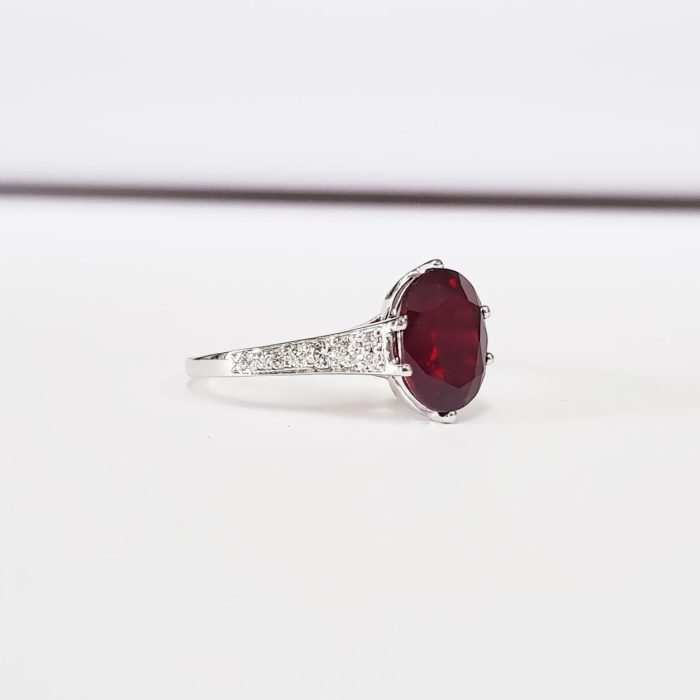 This brand new stunning ring features a central oval cut lab grown ruby, set in a gorgeous antique inspired mount, that has been studded with diamonds on the claws and down the shank!