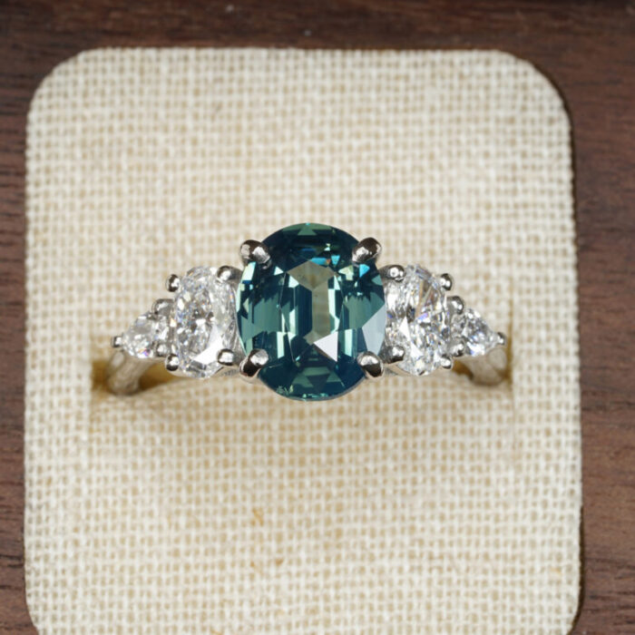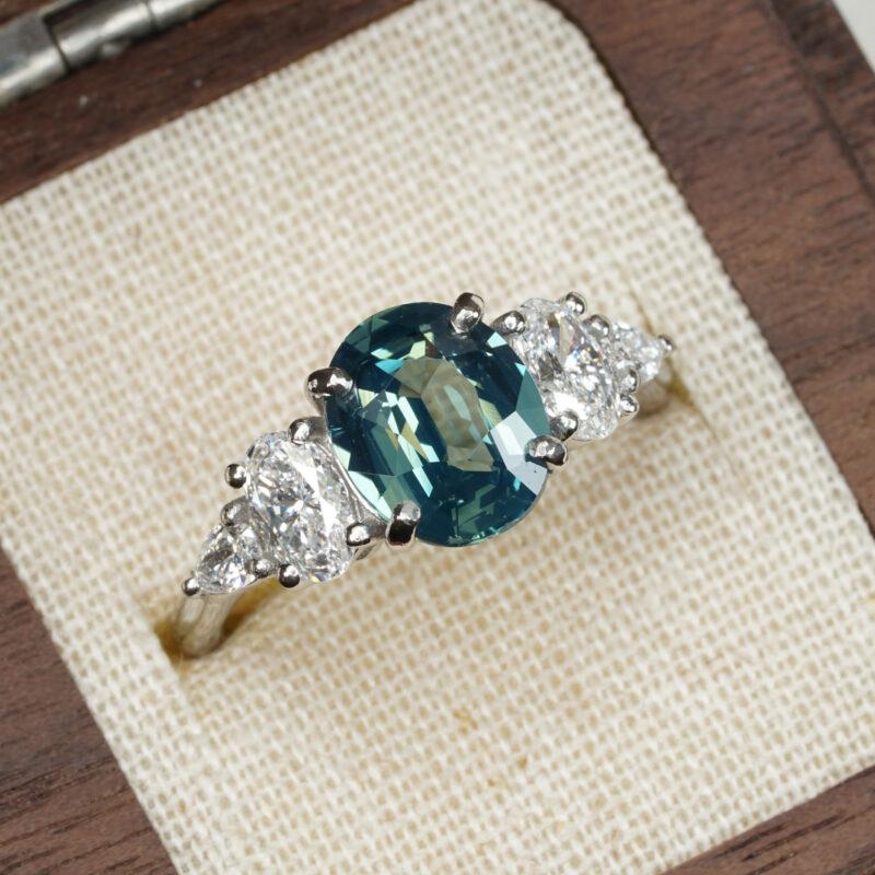 This brand new stunning ring features a central 3.04ct oval natural teal sapphire, that has been prong set with two oval and two pear cut lab grown diamonds, in an antique inspired platinum mount!