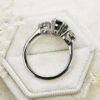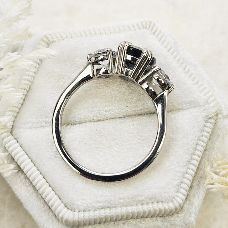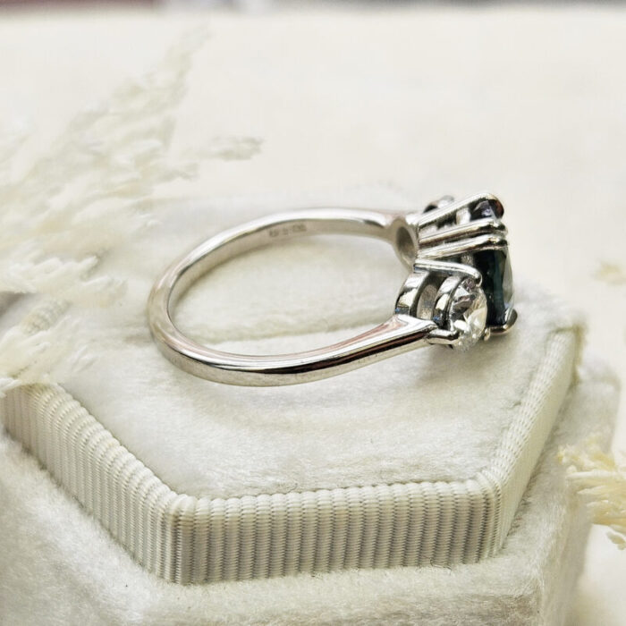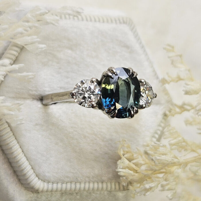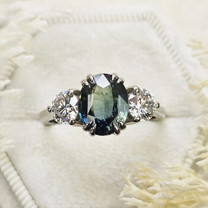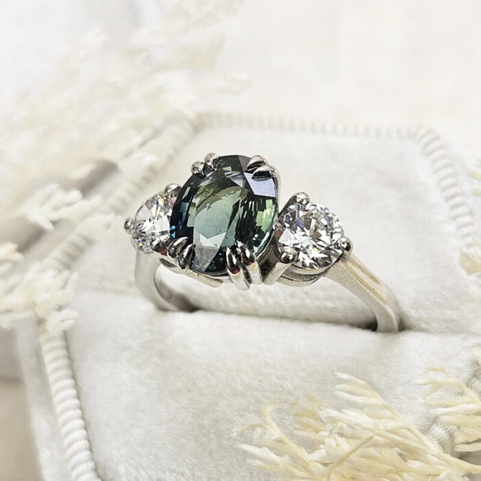 This brand new stunning ring features a central natural 3.01t oval cut teal sapphire, that has been double talon set with two brilliant cut lab grown diamonds, in a low profile platinum trilogy mount!