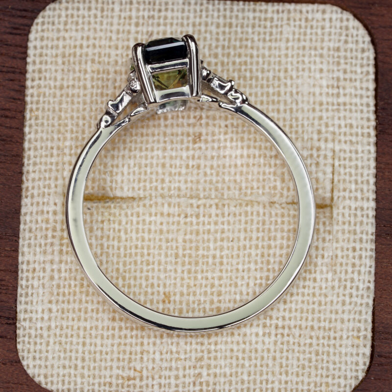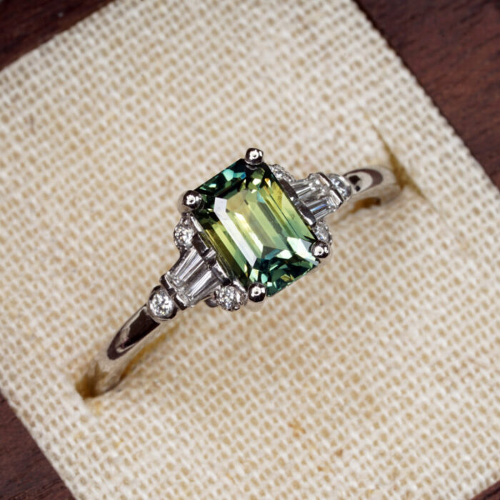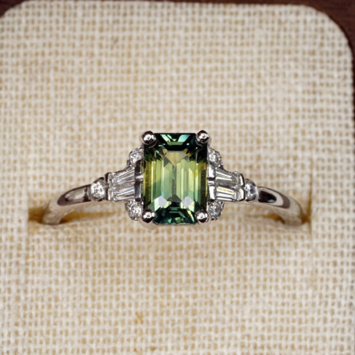 Sapphire: 1.55ct, emerald cut, 7.31×4.93×4.07mm, VS clarity, green-blue-yellow, certified unheated