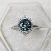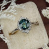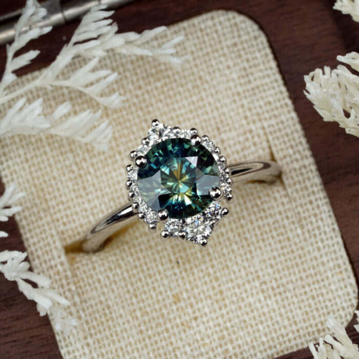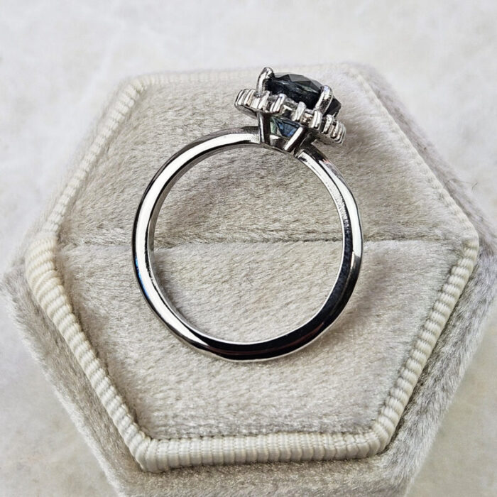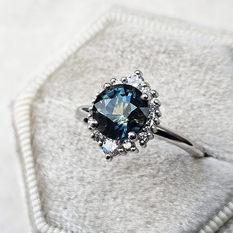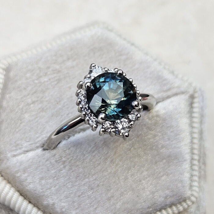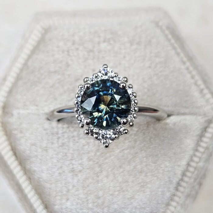 This absolutely gorgeous ring features a beautiful 2.56 carat natural round cut parti coloured sapphire. We have designed the ring around the Sapphire as a bespoke piece. It features a low profile diamond halo. The Sapphire is has been positioned to sit low to the finger, giving a sleek, flush appearance!
