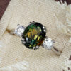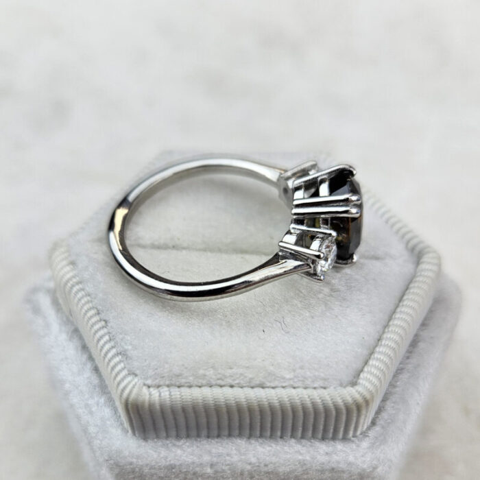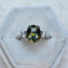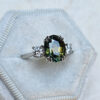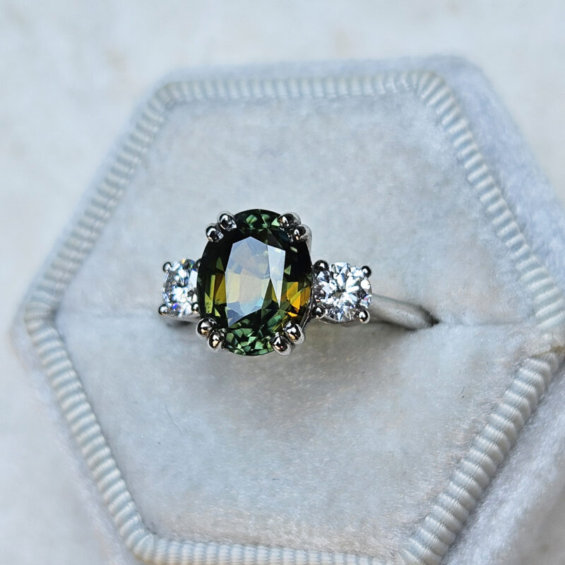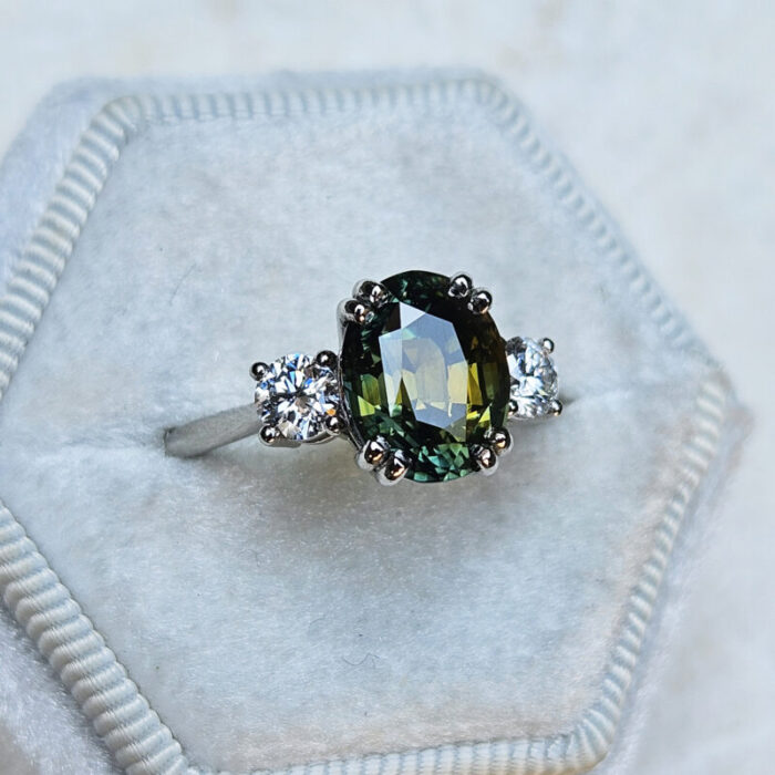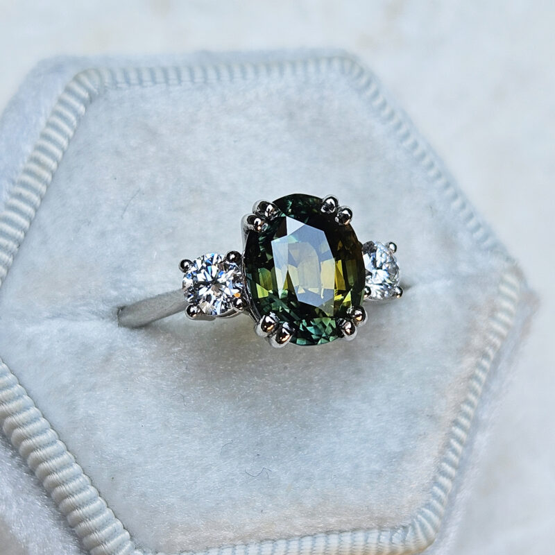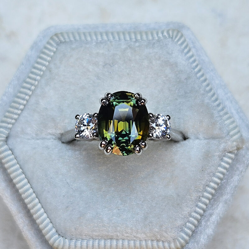 This brand new stunning ring features a central natural 4.52ct oval cut parti Sapphire. This gorgeous Sapphire has a unique mixture of deep, earthy oranges, yellows, greens and blues, reminiscent of the colours you might find in a work of Monet. It has been claw set with 2 brilliant cut lab grown diamonds, in a sleek and elegant low profile mount.