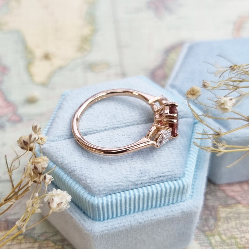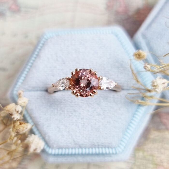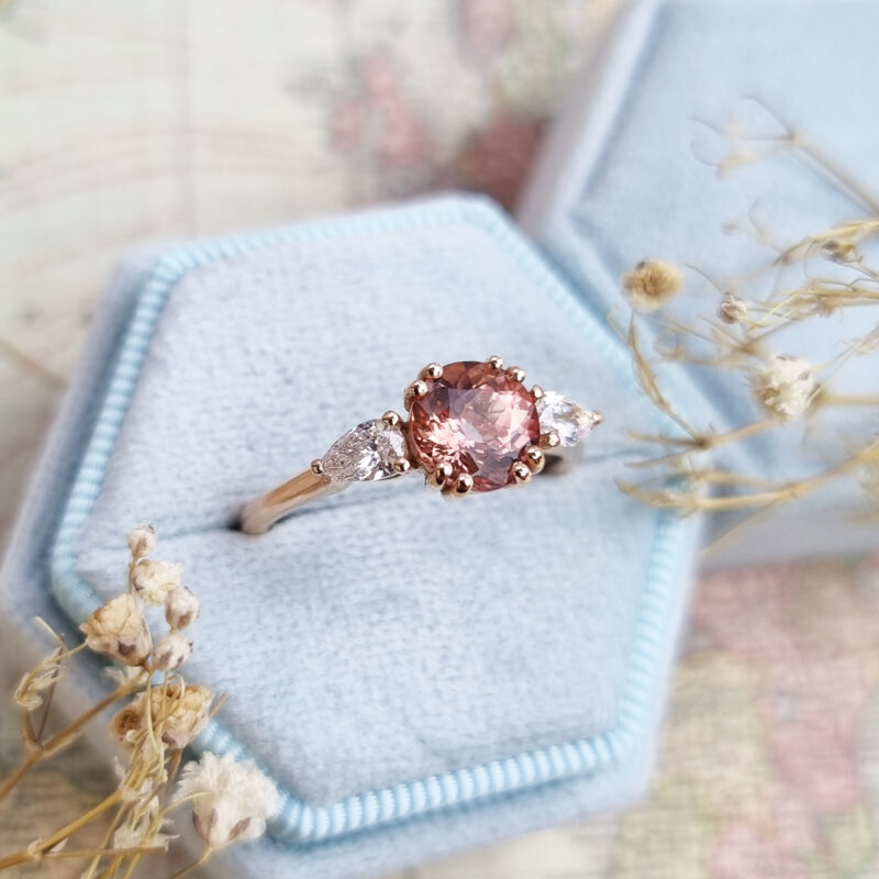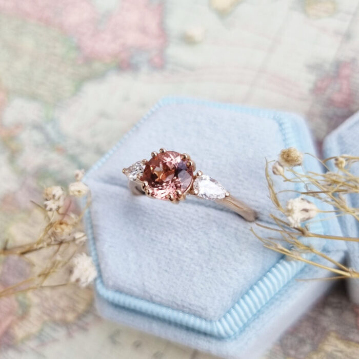 This brand new stunning ring features an impressive 1.41ct oval cut natural peach coloured tourmaline. It has been double prong set with two pear cut diamonds in a bespoke, slim band style 18ct rose gold mount!
