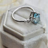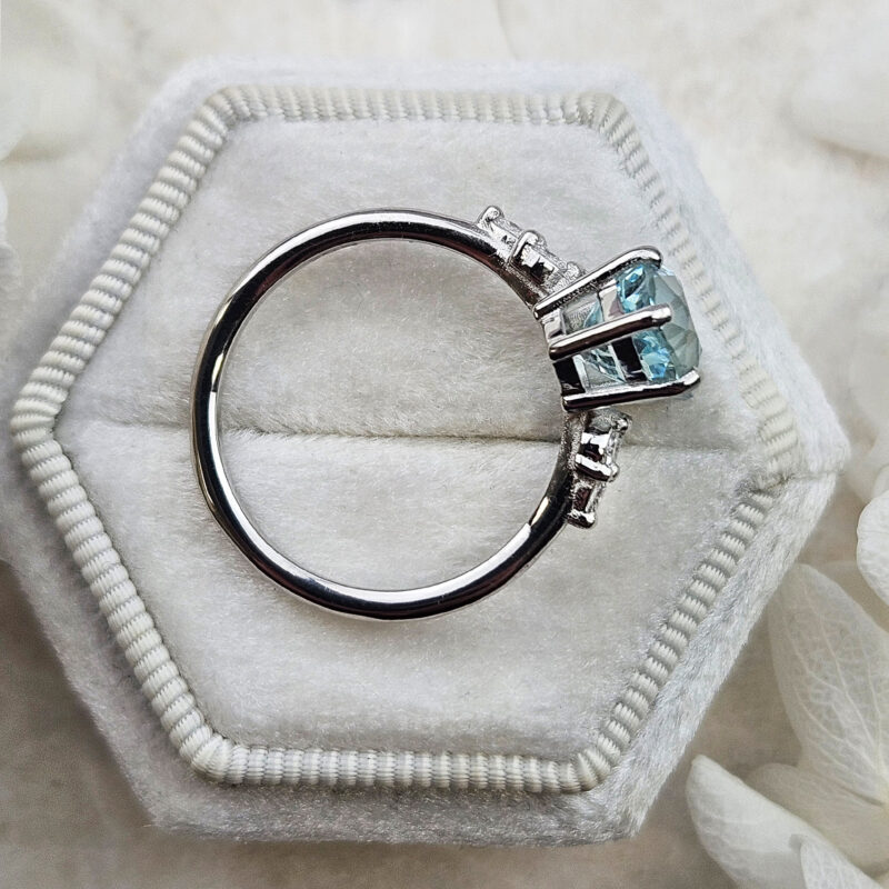 This brand new stunning ring features a central 2.75ct pear cut natural aquamarine, flanked by 6 round brilliant cut diamonds in a stunning low profile platinum mount!