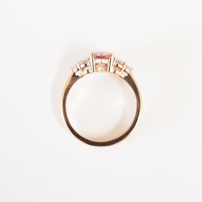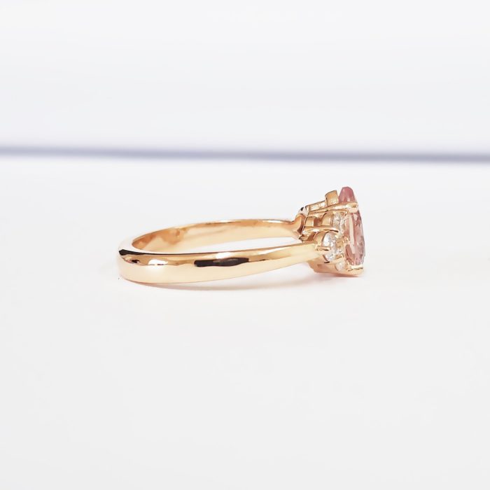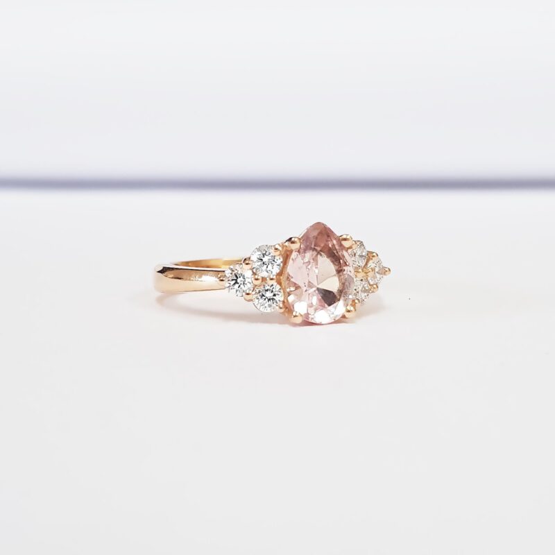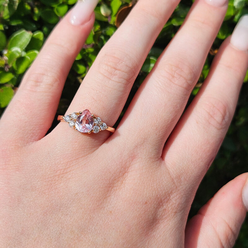 This brand new stunning ring features a central lab created pear cut champagne Sapphire, set in a stunning delicate mount that has been claw set by 6 brilliant cut moissanites!