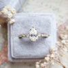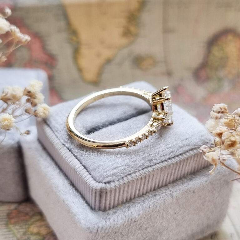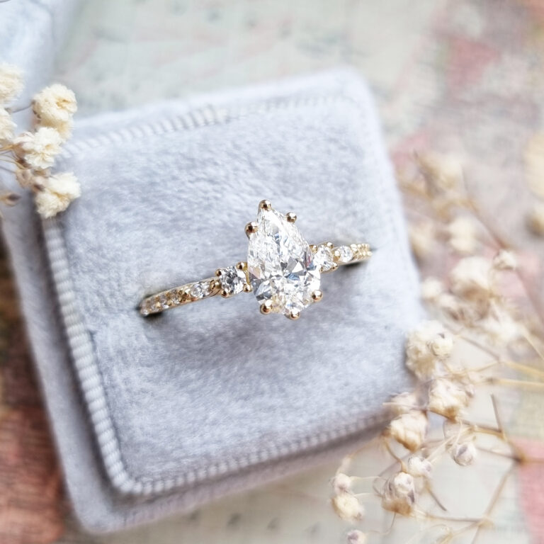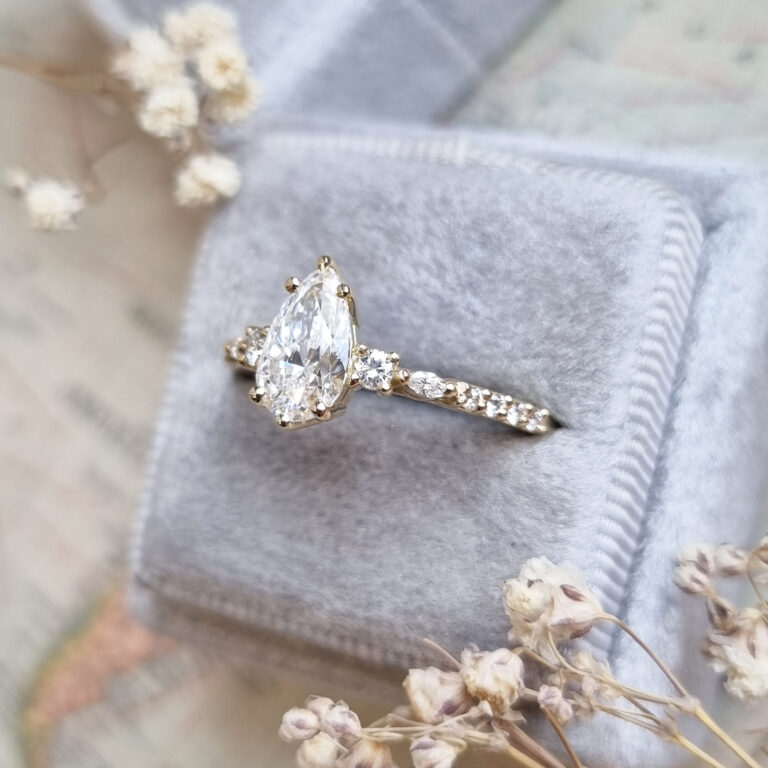 This brand new ring features a central 1 carat, E colour, VVS2 clarity lab grown pear cut diamond. It has been set in a beautiful antique inspired 18ct gold mount, with a mixture of round and marquise cut matching lab grown diamonds!