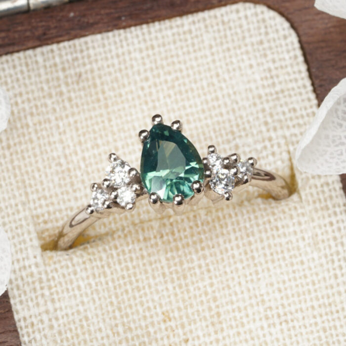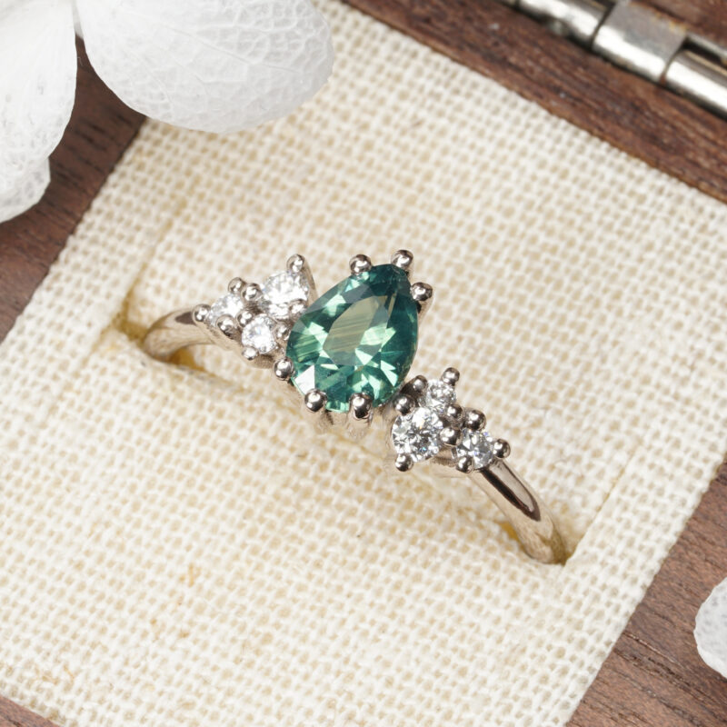 Central sapphire: 1.1ct, 7.1×5.3×3.9mm, green, VS clarity, pear cut