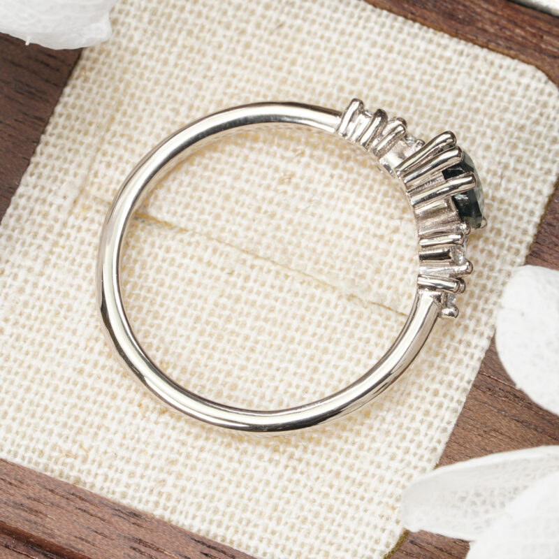 This brand new stunning ring features a central natural pear cut green Sapphire. It has been prong set with 6 brilliant cut diamonds, in a sleek and elegant low floral inspired mount. For this ring we have opted for un-plated 18ct white gold. This gives a beautiful off-white antique colour to the ring.