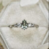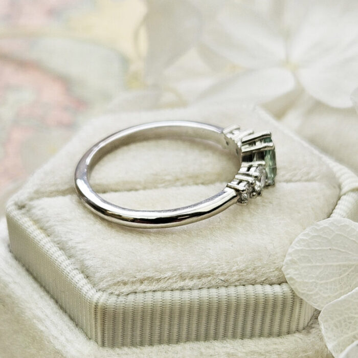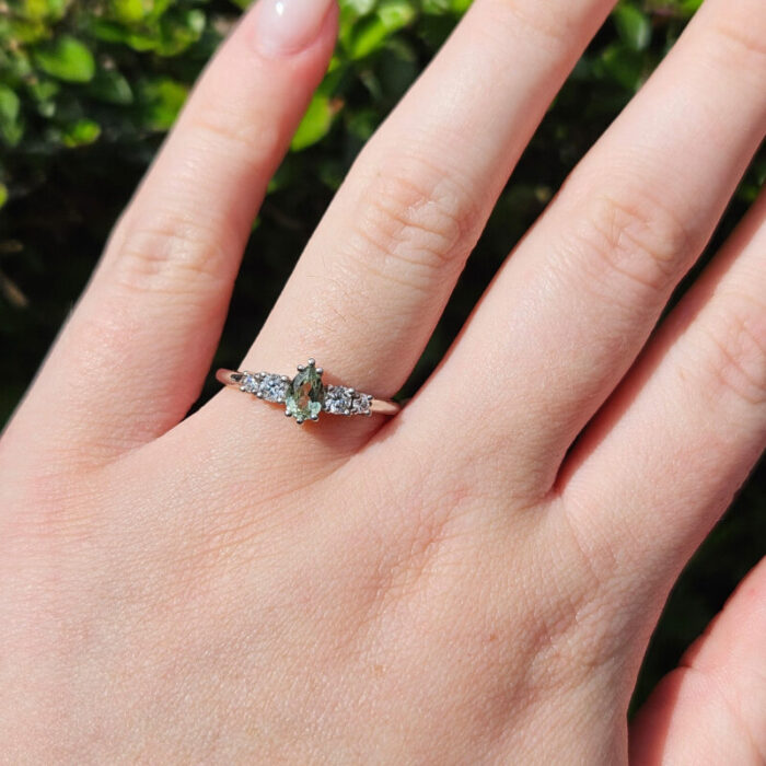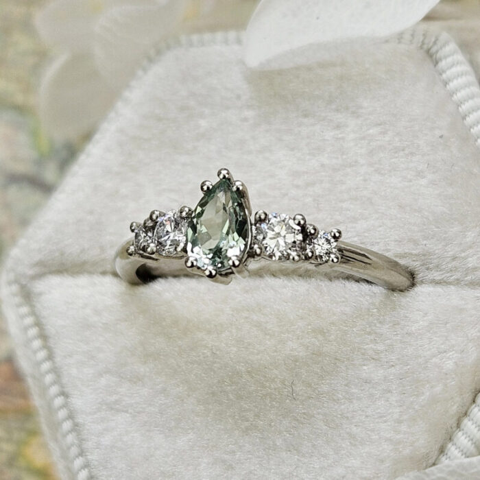 This brand new stunning ring features a central pear cut lab grown seafoam green Sapphire, that has been 6 prong set with 4 graduated brilliant cut lab grown diamonds, in a sleek and elegant low profile mount.