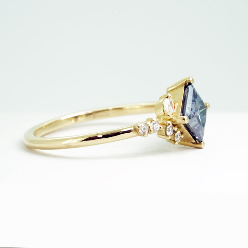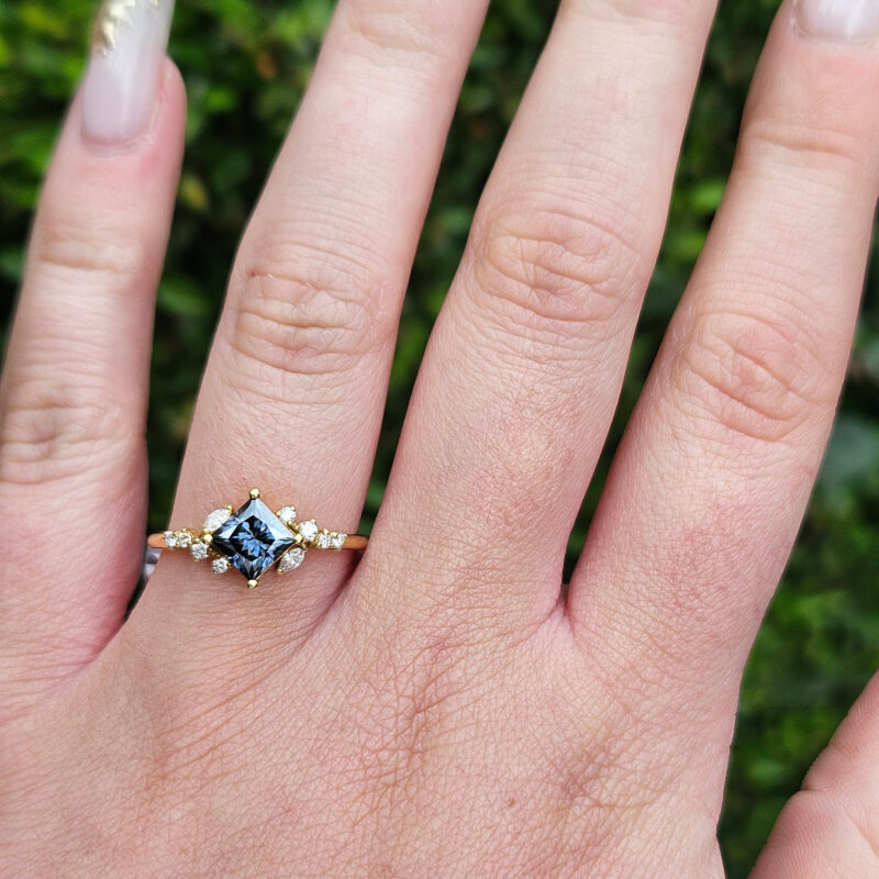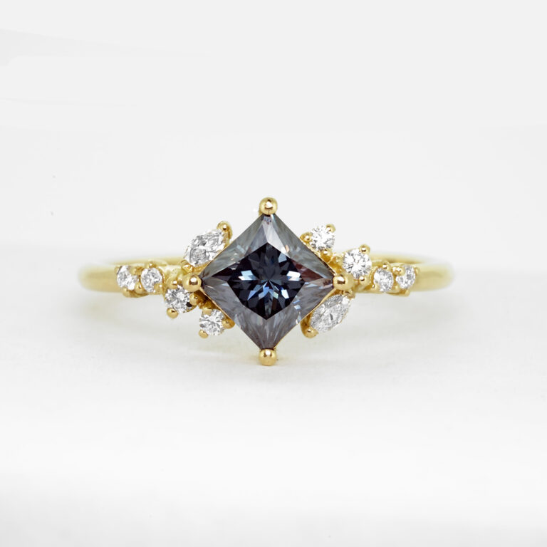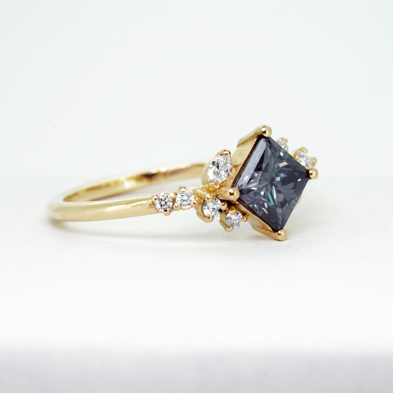 This brand new stunning ring features a central princess cut midnight grey moissanite, that has been claw set with 8 brilliant cut diamonds and 2 marquise cut diamonds, in a sleek and elegant low profile mount.
