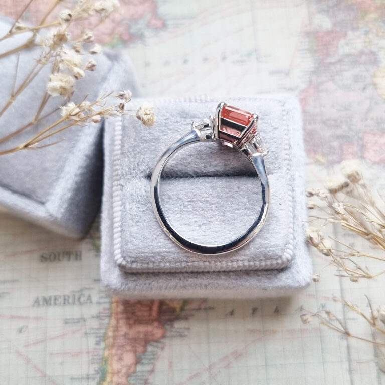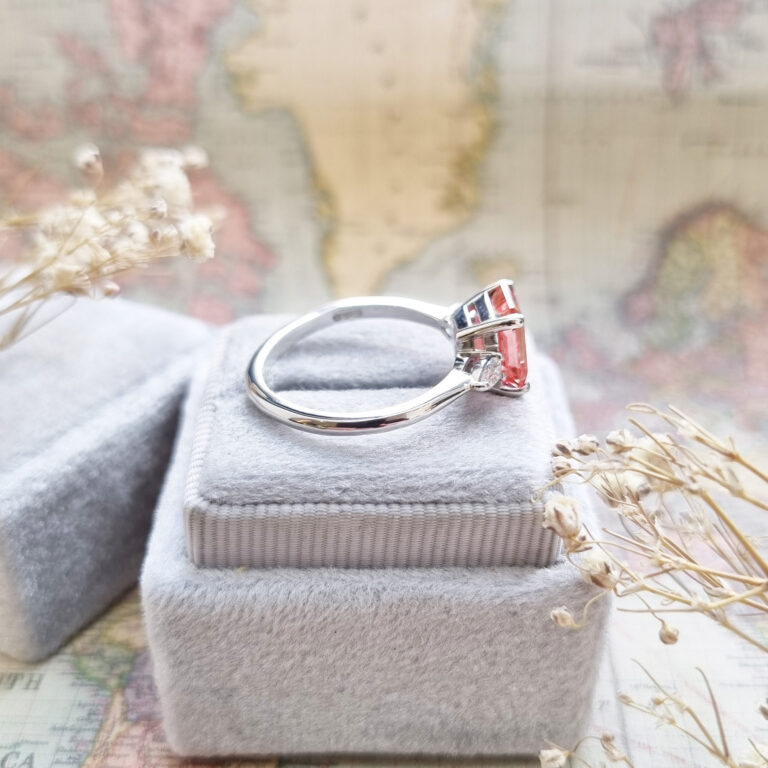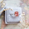 Radiant padparadscha sapphire and diamond trilogy ring