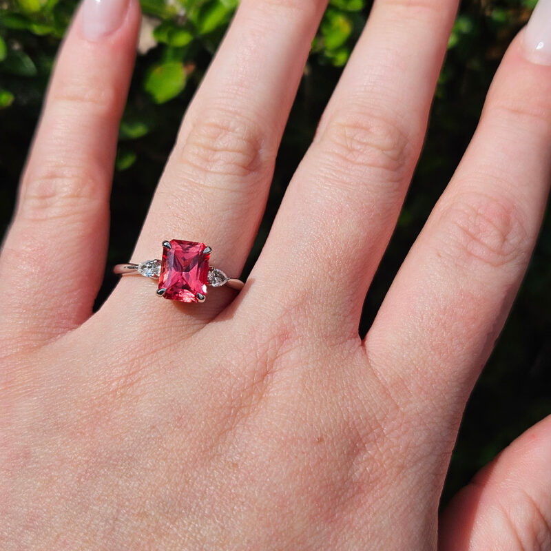 Central Sapphire: 9x7mm (2.8ct approx.), radiant cut, pink-orange, VVS clarity, Chatham created