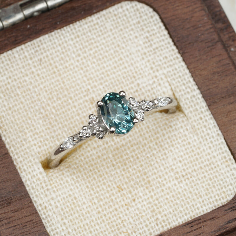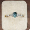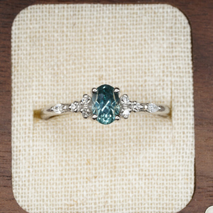 Centre Sapphire: 1.05ct, oval ‘Regal Radiant’ cut, 5.9×4.6mm, Montana origin (heated), green-blue