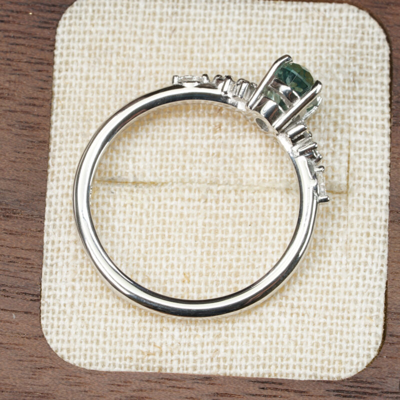 This brand new stunning ring features a central natural 1.05ct Montana teal sapphire. The sapphire has been cut by world famous John Dyer, in his unique oval ‘Regal Radiant’ cut. The facets are arranged to give maximum brilliance with an interesting facet pattern. One of its unique features is that a flower or star like pattern can be seen around the central facet (table facet) on the front of the gem.
