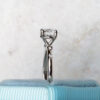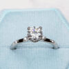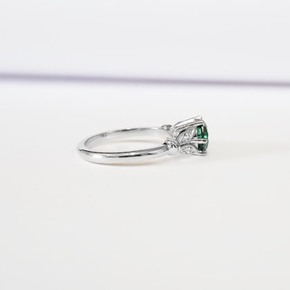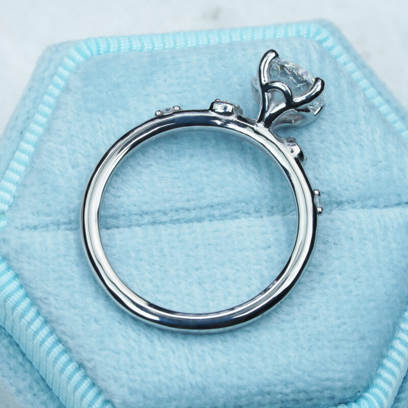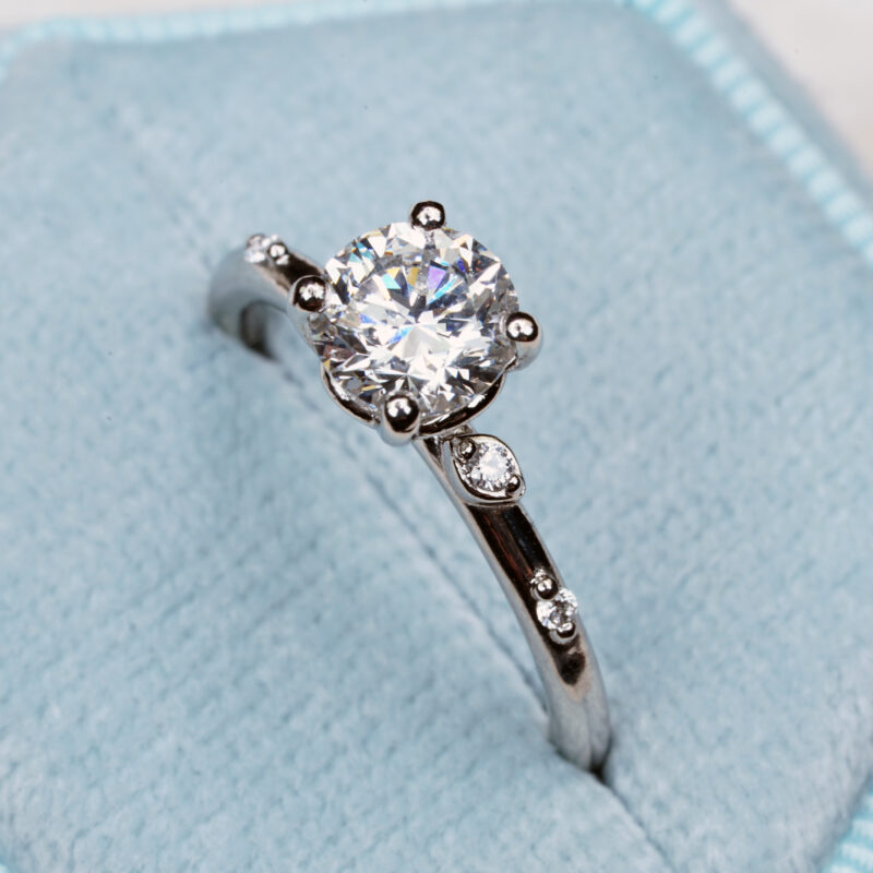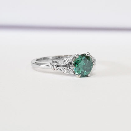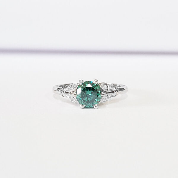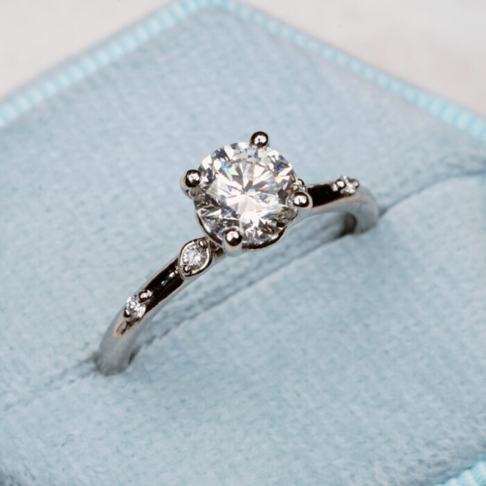 This elegant ring features a central 1ct round brilliant cut lab grown diamond, in a 4 prong setting. The platinum band has been accented with subtle floral motifs and diamonds!