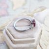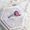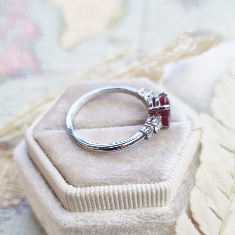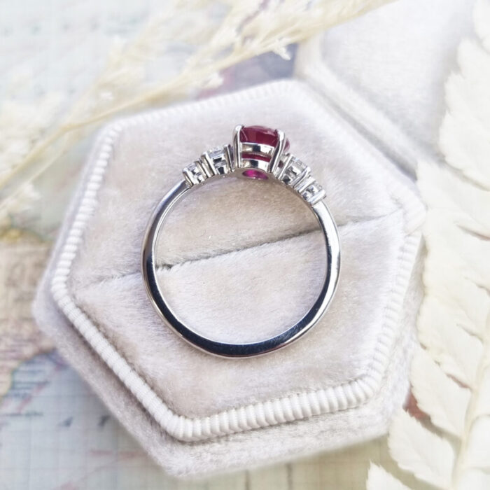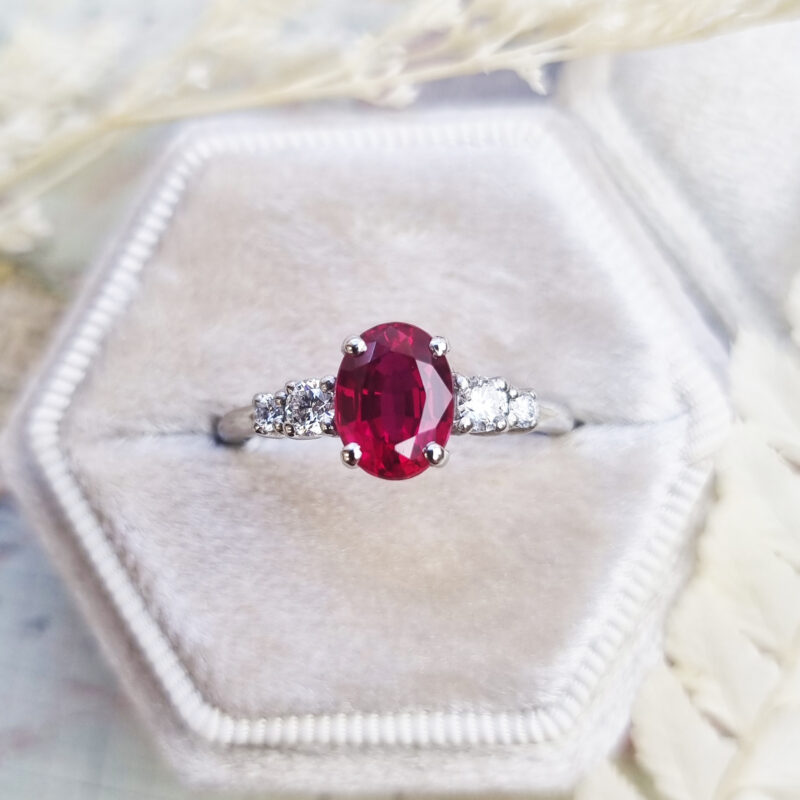 This brand new stunning ring features a central oval cut lab grown Ruby, that has been prong set with 4 graduated brilliant cut lab grown diamonds, in a sleek and elegant low profile mount.
