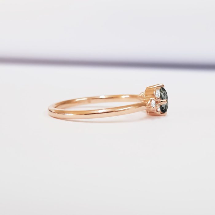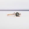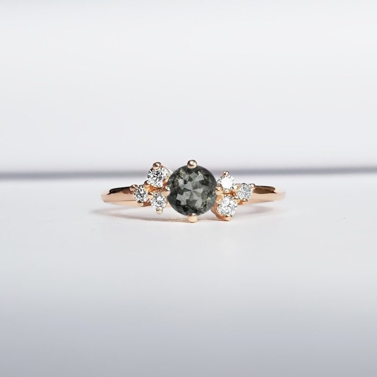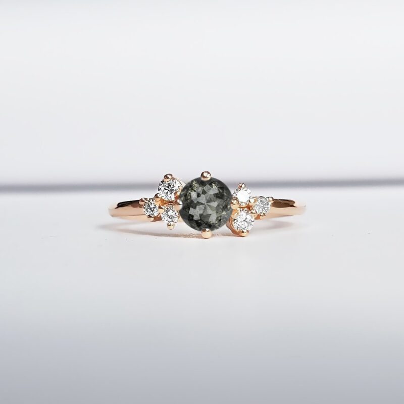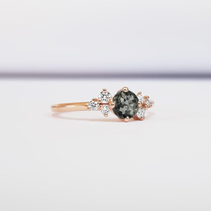 This brand new stunning ring features a central cabochon cut Salt and pepper diamond, that has been claw set with 6 brilliant cut diamonds, in a sleek and elegant low profile mount.