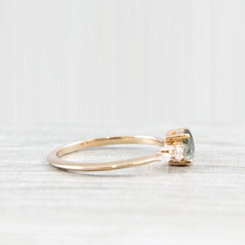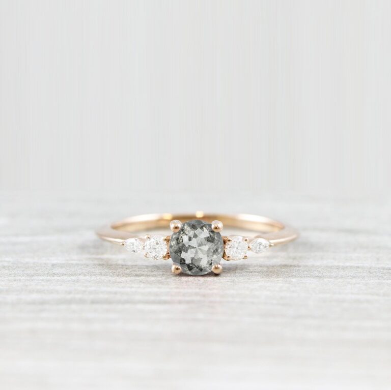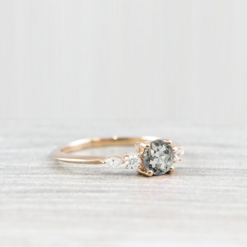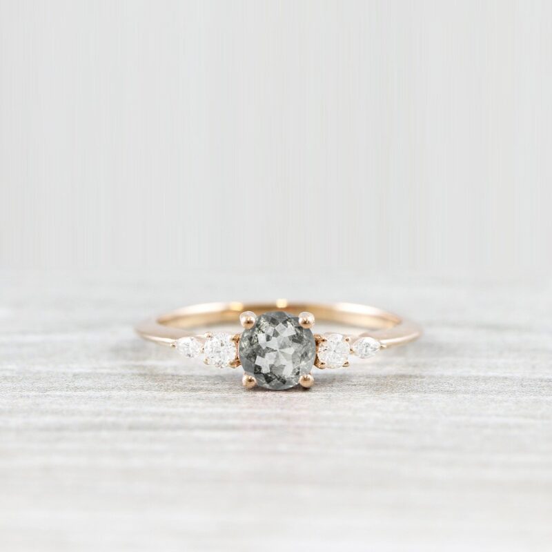 This brand new stunning ring features a central rose cut salt and pepper diamond, set with 4 marquise and round shape diamonds in a petite style mount!