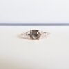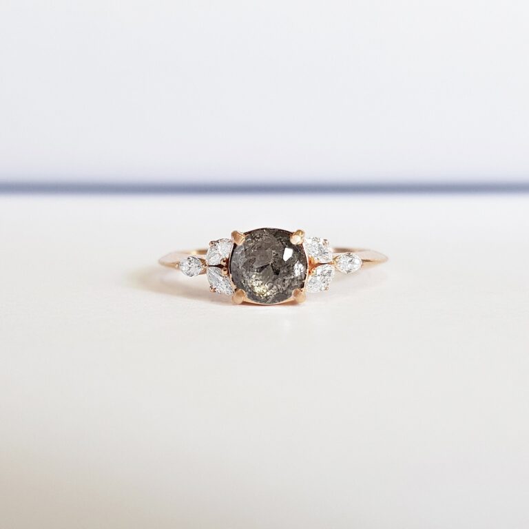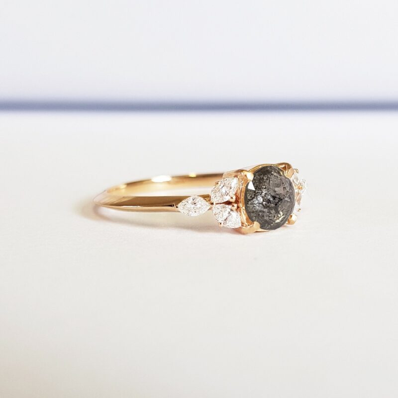 This brand new stunning ring features a central rose cut salt and pepper diamond, set in a stunning delicate mount that has been claw set by 6 marquise diamonds!