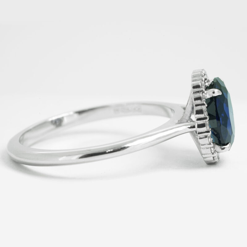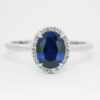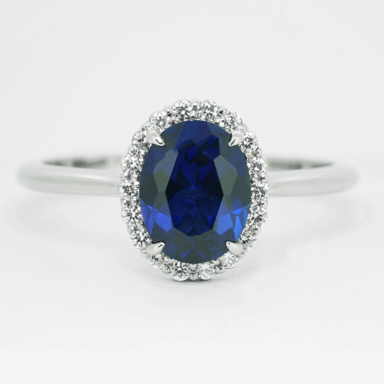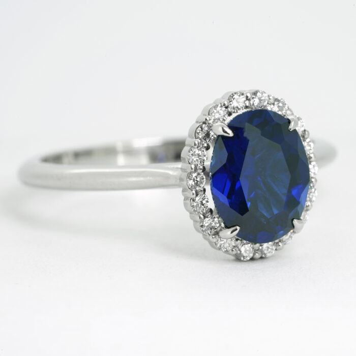 This lovely ring features a central 2ct faceted oval lab grown sapphire, surrounded by a halo of diamonds in a gold or platinum mount!