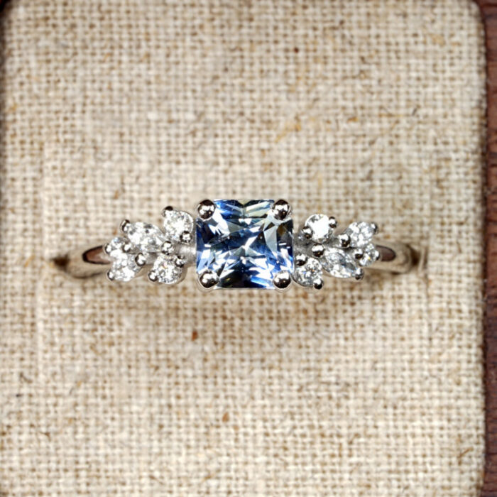 This brand new stunning ring features a central natural 1.30ct square radiant cut icy blue sapphire. It has been 4 prong set with a floral arrangement of marquise and round brilliant cut diamonds, in a low profile platinum mount!