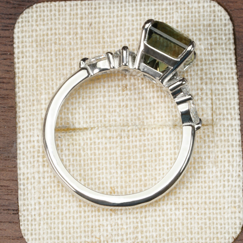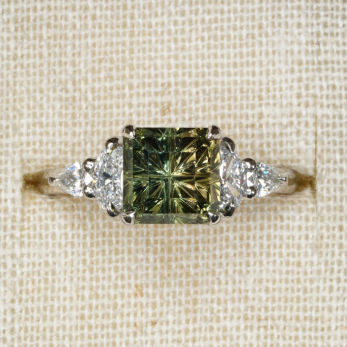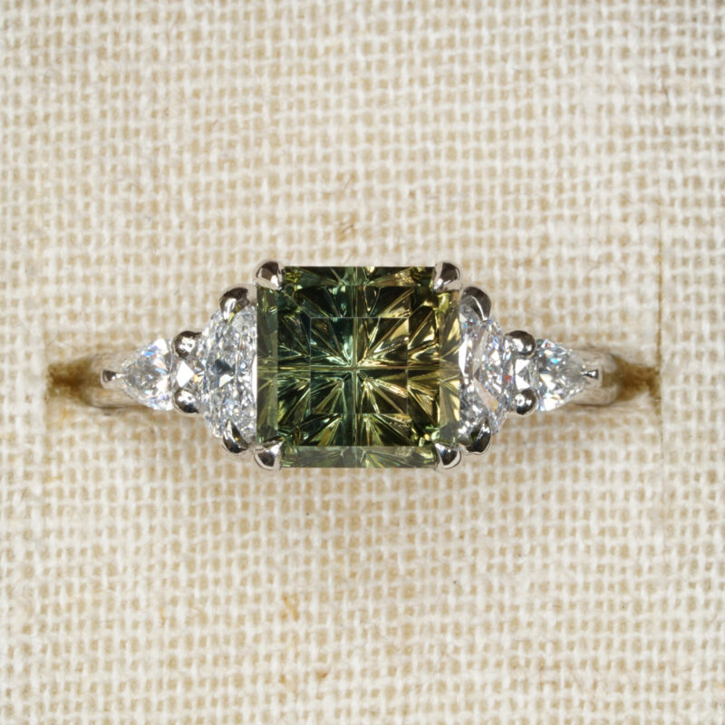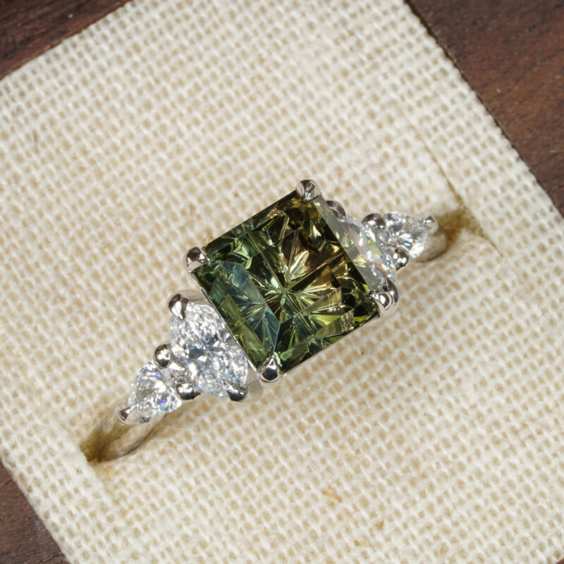 This gorgeous ring features a totally unique ‘Starbrite’ square cut green Tourmaline, carved by award winning gem cutter John Dyer!