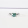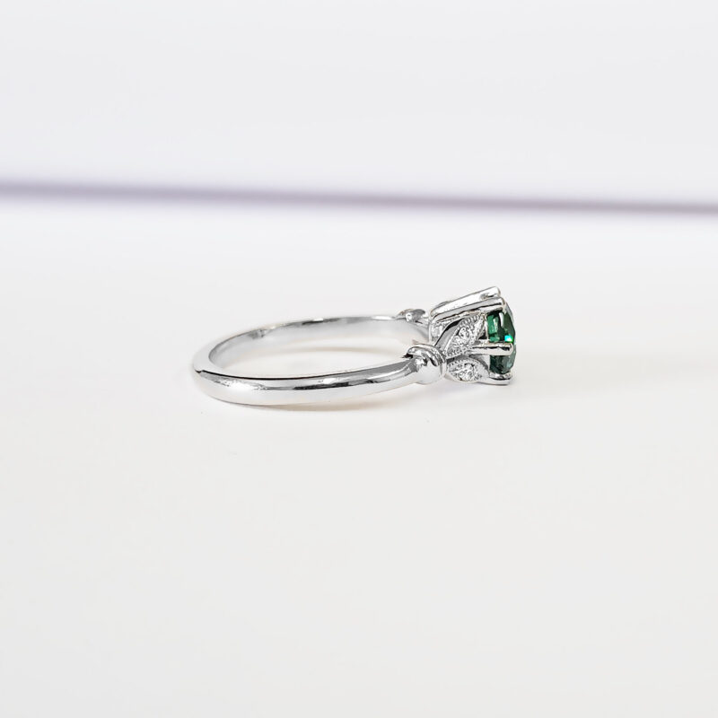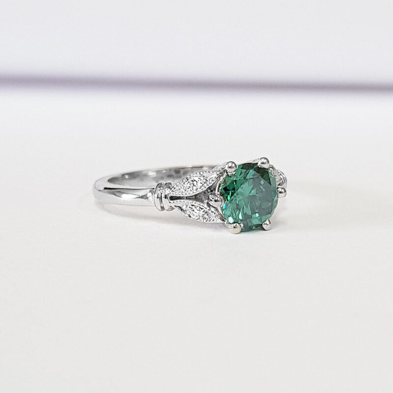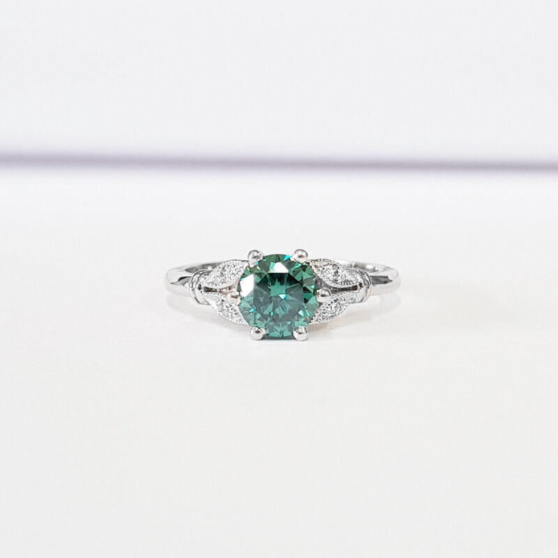 This brand new stunning ring features a central teal blueish green round hearts and arrows Moissanite, set in a gorgeous floral inspired gold mount, with 4 diamond accent stones!