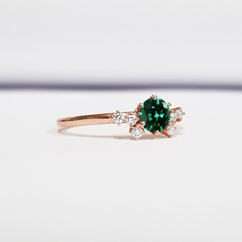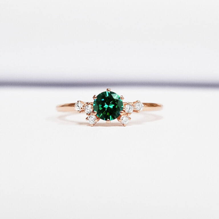 Center teal green moissanite: 0.5 carats, 5mm, VVS clarity