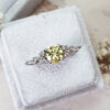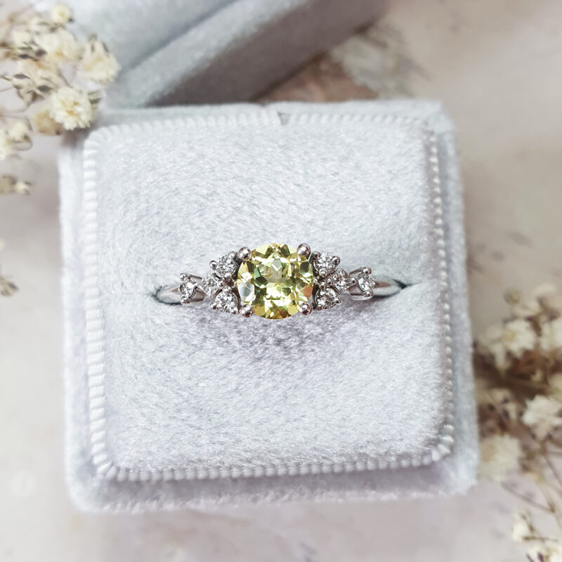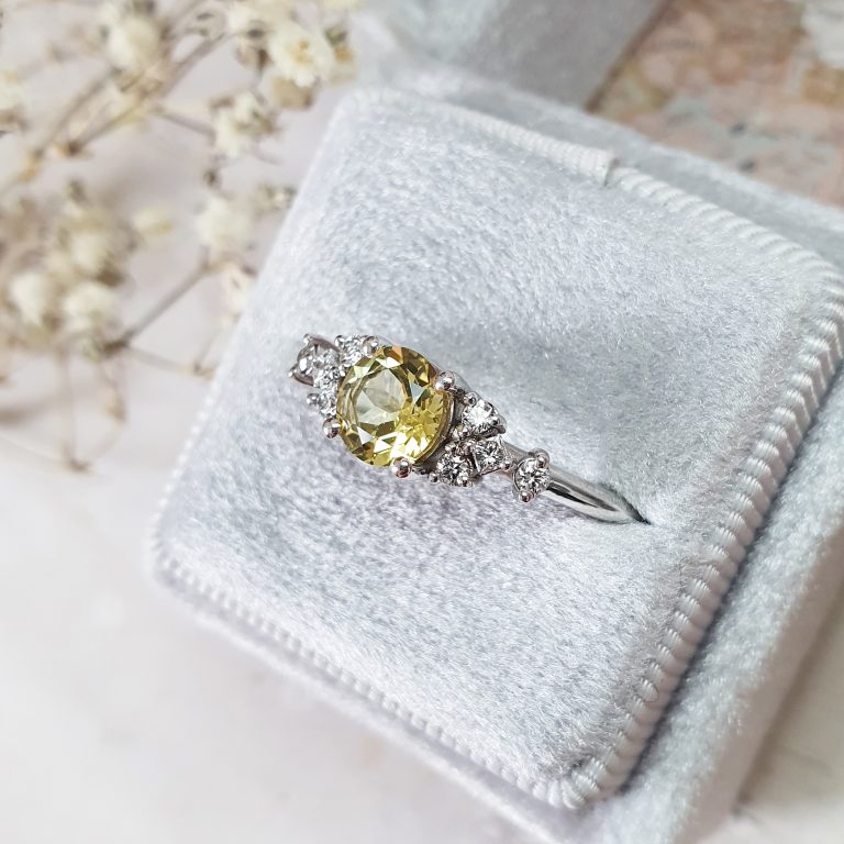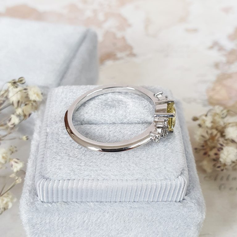 This brand new stunning ring features a central lab created lemon yellow Sapphire, set in a stunning delicate mount that has been claw set by 6 brilliant cut and 2 princess cut diamonds!