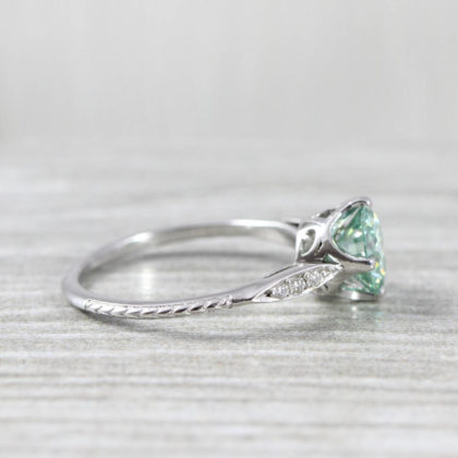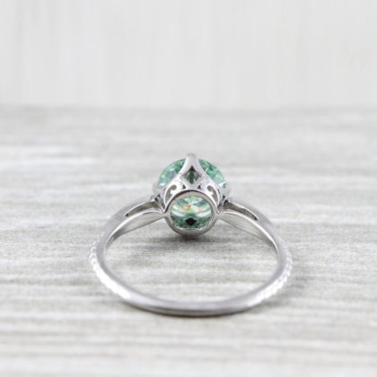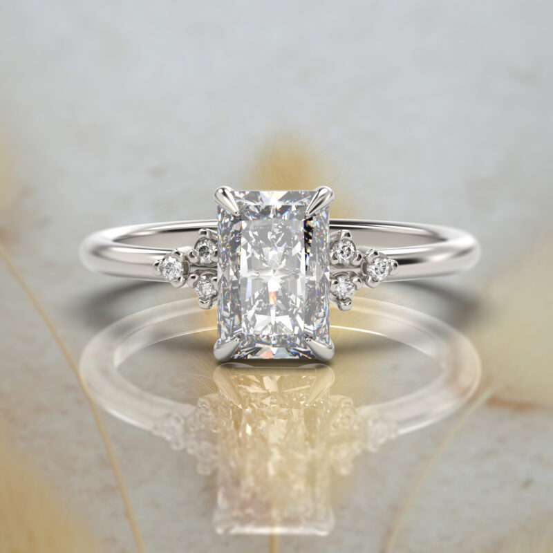 This gorgeous ring features a central 2ct radiant cut lab grown diamond. It has been talon set in a sleek, slim style platinum mount, with 6 accent round brilliant cut lab diamonds!